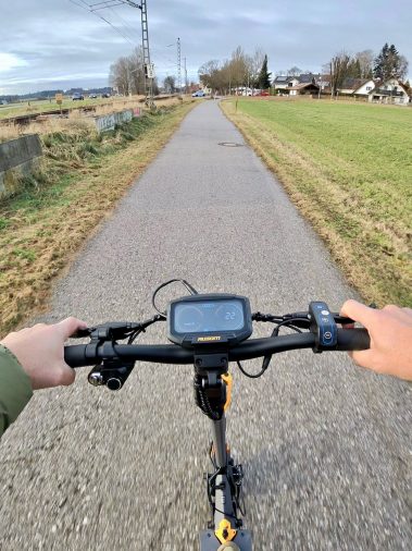 Die Höchstgeschwindigkeit ist, wie vorgeschrieben, auf 20 km/h begrenzt (auf dem Tacho können es wegen Toleranzen ca. 21–22 km/h sein). Auch wenn sich das erstmal wenig anhört: Durch den kräftigen Antritt und die stabile Lage fühlt sich der Scooter keineswegs langsam an.