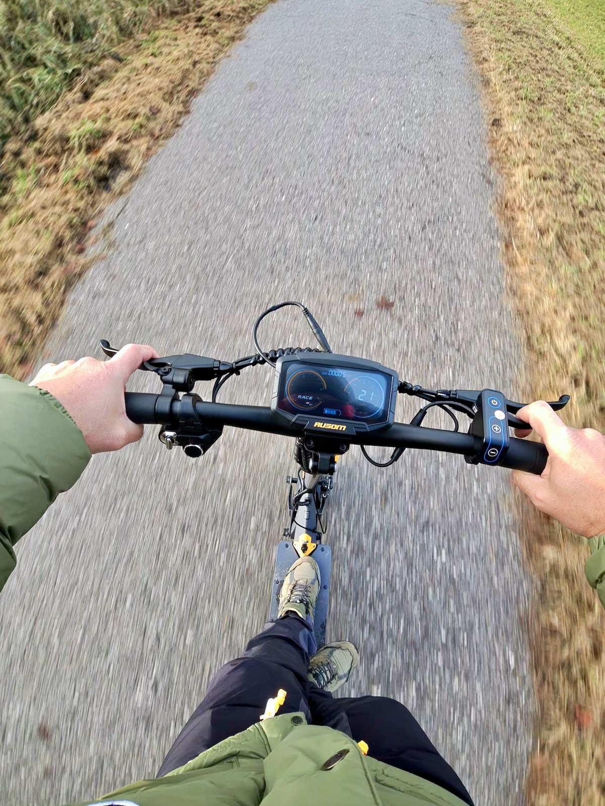 Im Video siehst du den AUSOM L1 ABE im echten Alltagseinsatz: Beschleunigung, Fahrkomfort, Verhalten auf schlechteren Wegen, Bremsen und natürlich, wie sich das Gewicht von knapp 28 kg anfühlt.