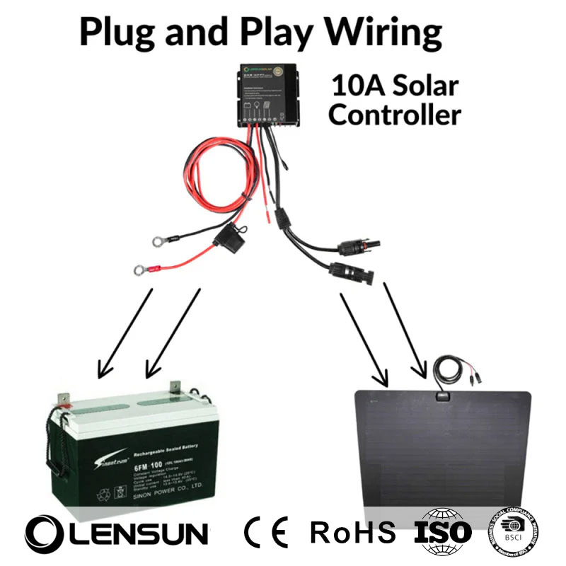 - Optional: 10A wasserdichter MPPT‑Solarregler (Plug‑and‑Play, mit Sicherungen/Anschlüssen)