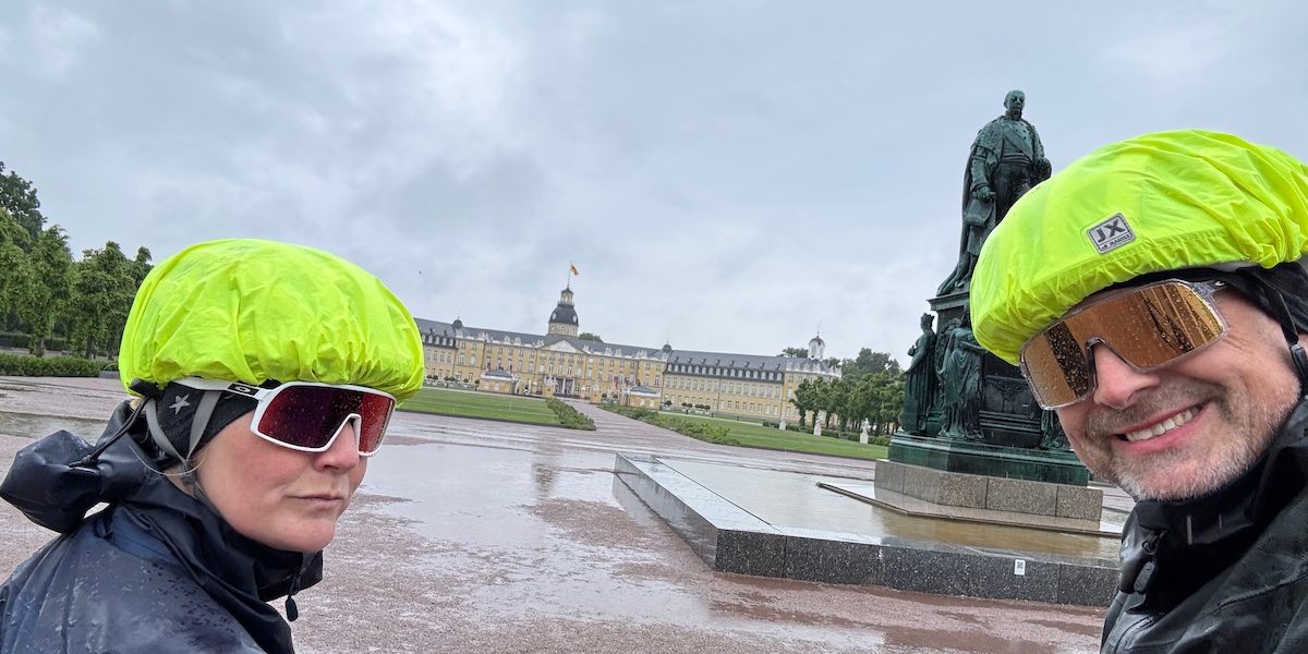 Am nächsten Morgen, nach einem leckeren schwäbischen Frühstück mit Laugenweckle, ging es weiter. Der Regen war unser ständiger Begleiter auf dieser Etappe, die uns 96 km und 850 Höhenmeter durch den Pfälzerwald und Karlsruhe führte. Die Stadt bot uns trotz des Regens einen schönen Anblick, aber die Strecke entlang des Rheins und der Autobahn war alles andere als angenehm.